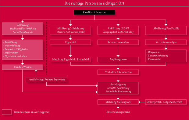 Dies setzt vor allem zwei Situationen voraus: Die Mitarbeiterin oder der Mitarbeiter sollte seine Ressourcen, sein Leistungspotential, seine Verhaltensweisen und seine Bedürfnisse im weitesten Sinne kennen: Ist man ein klassischer Teamplayer, arbeitet man gerne projektorientiert? Braucht man Leitplanken oder Unabhängigkeit? Alles wichtige Faktoren, die einer Mitarbeiterin oder einem Mitarbeiter die Wohlfühlsituation und die Leistungsfähigkeit innerhalb einer Unternehmung geben. Die Unternehmung sollte wissen, welche Aufgaben die Stelle beinhaltet. Wie sind die Erwartungshaltungen bezüglich Eigendynamik, Prozessorientierung, Leadership, Kommunikationsfähigkeit, Nachhaltigkeit u.v.m. Alles Verhaltensweisen, die wenig mit den Sach- und Fachkenntnissen der Mitarbeiter zu tun haben aber auf die Leistungsfähigkeit und auf Entwicklungen innerhalb der Firma grossen Einfluss haben. Je präziser und umfassender beide Voraussetzungen erkannt werden, desto grösser sind die Chancen eine vakante Stelle mit einer den Anforderungen entsprechenden Persönlichkeit sinnvoll mittel bis langfristig zu besetzen. Zum Nutzen aller! Die Abklärungen laufen auf mehreren Ebenen und umfassen einerseits die traditionellen Verfahren im Sach-/Fachbereich (Wissensstand); anderseits die Verhaltensweisen und Ressourcen durch Erhebungen mit drei verschiedenen Messsystemen. Hier nehmen wir auch die modernsten, wissenschaftlich verifizierten und computergestützten Verfahren zu Hilfe.